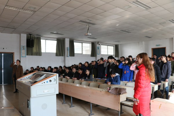 在主持人简单强调会议纪律后,大会开始,全体人员起立,会场奏响了令人热血沸腾的《国际歌》。随后,学工办主任虢利钢带领新发展党员在党旗前进行了庄严宣誓。宣誓结束后,虢利钢上台发表讲话。他向在座党员解释了“准备为共产主义奋斗终身”这句话的意义以及入党的含义。他总结道:“发展入党是一份无上荣誉,这份荣誉渗透在每个党员同志的学习工作中,公示在身边每个老师同学的心目中,颁发在每个党员的成长道路上,这是一个终身追求的目标。”在虢主任精彩发言之后,老党员姚丹上台,她代表老党员对新党员提出了要求,表达了对新党员的祝愿,并希望他们为党旗争辉。接着,新党员代表邓婉珍上台讲话。为实践好对党的事业,她对自身作出四点保证,并承诺将以身作则。大会最后,院党支部负责人谢林讲话。在讲完相关党支部工作的总结安排后,他强调了关于学生党支部机构设置、党员考核体系、党内违纪处分等问题。最后,本次大会在热烈的掌声圆满结束。