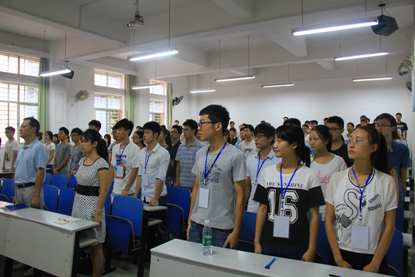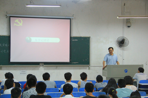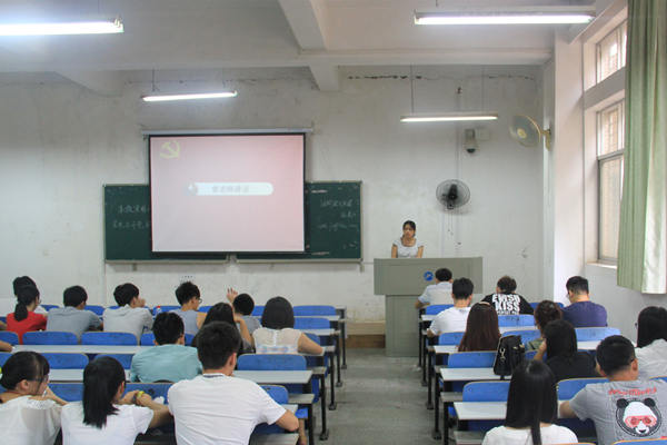 大会伊始,奏国际歌,全体党员肃立,行注目礼。首先,易贵元上台讲话。他主要就学校及学院今年的招生问题做了简单介绍,并督促大家要在开学迎新时一边实践一边学习。紧跟着,曾竞兴上台讲话。她主要强调了学生党员的学习和考研问题,她认为学生党员们应该重视学习和考研问题,把学习学好,努力考研。对于一些想找工作的同学,曾竞兴提醒大家要提高警惕,防止受骗,保护好自身的安全。最后,党建办公室主任龙泽精简单地介绍了一些工作安排。主要包括迎新工作的一些细节工作,以及助班蹲点对所负责班级做挂科情况调查、假期生活后的心理问题和家庭经济贫困调查等工作。