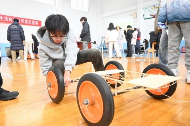比赛现场气氛紧张热烈。入围校赛的各支队伍依次进行作品展示与加载测试。荷载逐级施加的过程中,模型的受力表现成为全场焦点。部分作品凭借科学的结构体系与精细的制作工艺,成功承受高强度荷载,赢得现场阵阵掌声;个别模型在测试中出现失效情况,参赛选手沉着应对,清晰阐述设计思路与优化方向,充分展现出良好的工程素养与竞赛态度。